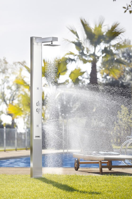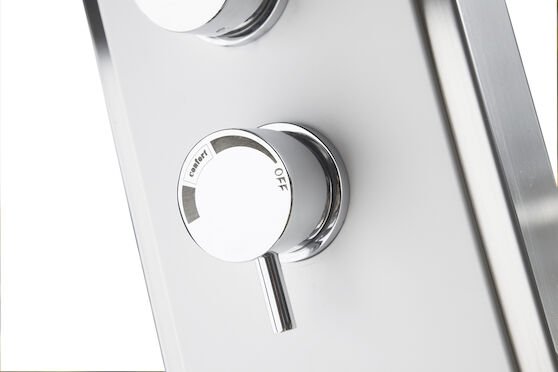 Chuveiro de aço inoxidável mate AISI-316L para água fria e quente, com embelezador frontal branco em