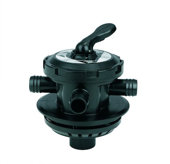 Válvula seletora de 6 vias para filtros de piscina elevada onde a pressão não ultrapassa os 1,5 bar, de diâmetro máximo 380 mm.